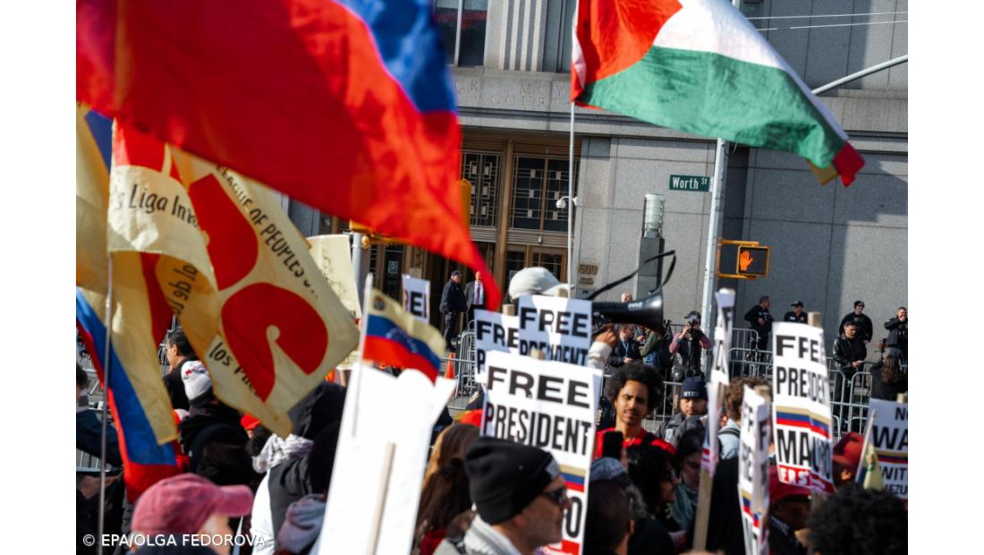 Do lado direito, um grupo mais pequeno defendia a libertação imediata de Nicolás Maduro, que, juntamente com a mulher, Cilia Flores, foi capturado em 03 de janeiro durante uma operação militar dos Estados Unidos em Caracas.