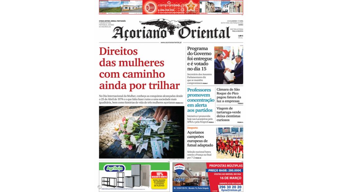 "Direitos das mulheres com caminho ainda por trilhar" é a manchete da edição desta sexta-feira do Açoriano Oriental.