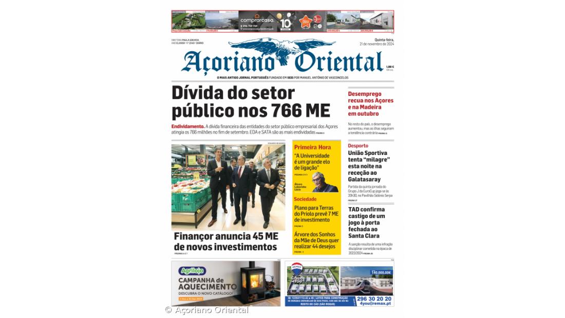 A manchete do Açoriano Oriental revela que "a dívida financeira das entidades do setor público empresarial dos Açores atingia os 766 milhões no fim de setembro", sendo que a EDA e SATA são as empresas mais endividadas