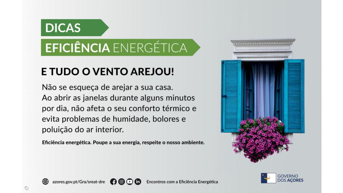 Conteúdo Patrocinado E TUDO O VENTO AREJOU! Não se esqueça de arejar a sua casa. 10 de jan. de 2020, 01:00 Autor: Conteúdo Patrocinado Ao abrir as janelas durante alguns minutos por dia, não afeta o seu conforto térmico e evita problemas de humidade, bolores e poluição do ar interior. Eficiência energética. Poupe a sua energia, respeite o nosso ambiente.