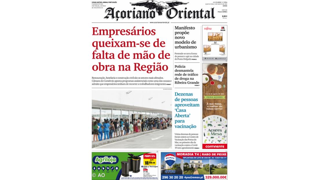 Setores da restauração, hotelaria e construção civil são os mais afetados. Câmara do Comércio admite que empresários tenham de recorrer a mão de obra imigrante. O assunto está em destaque no Açoriano Oriental de quinta-feira, 5 de agosto de 2021.