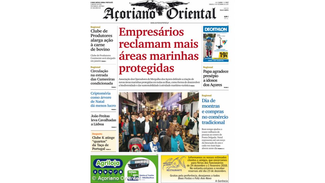 A manchete do Açoriano Oriental destaca que a Associação dos Operadores de Mergulho dos Açores defende a criação de novas áreas marinhas protegidas em todas as ilhas do arquipélago, como forma de desenvolver a biodiversidade e dar sustentabilidade à atividade marítimo-turística.