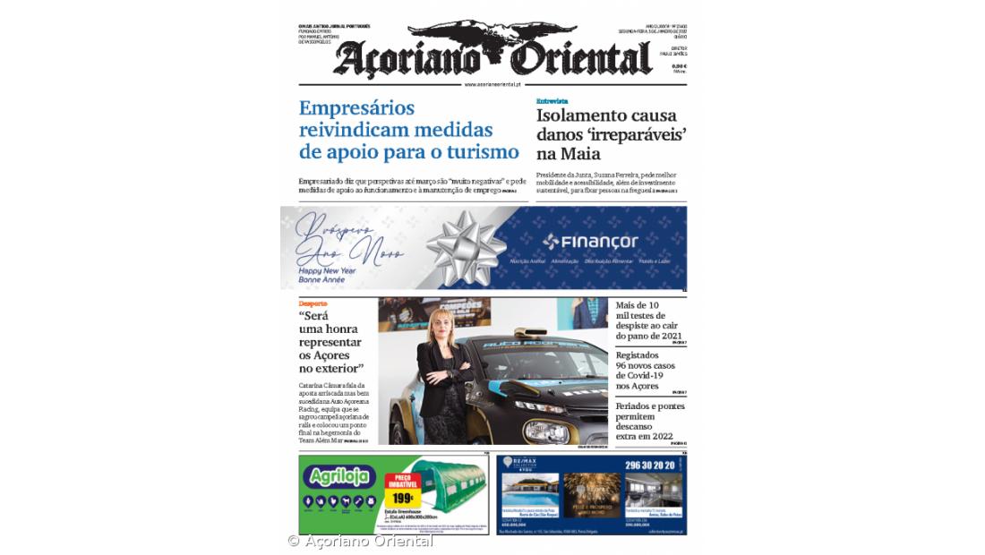 "Será uma honra representar os Açores no exterior" é a manchete fotográfica em alusão à entrevista de Catarina Câmara, da Auto Açoreana Racing. "Isolamento causa danos 'irreparáveis' na Maia", "Mais de 10 mil testes de despiste ao cair do pano de 2021", "Registados 96 novos casos de Covid-19 nos Açores" e "Feriados e pontes permitem descanso extra em 2022" são os restantes títulos de capa do Açoriano Oriental.