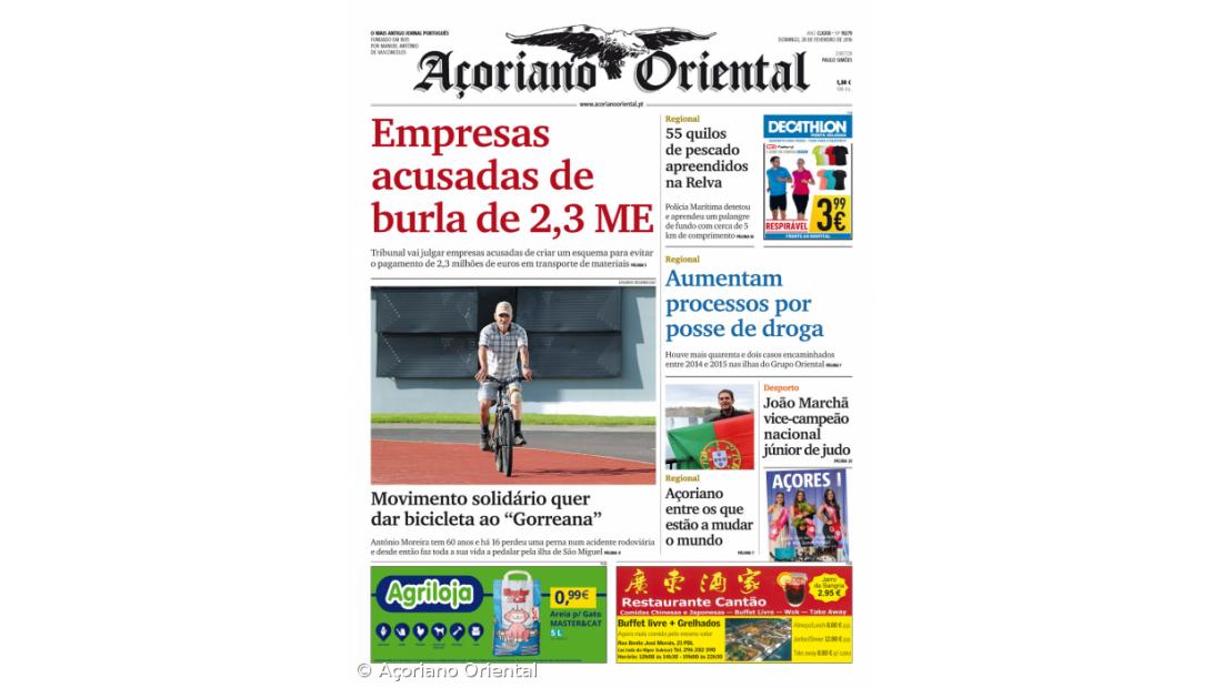 A manchete do Açoriano Oriental destaca que o Tribunal de Ponta Delgada vai julgar empresas acusadas de criar um esquema para evitar o pagamento de 2,3 milhões de euros em transporte de materiais.