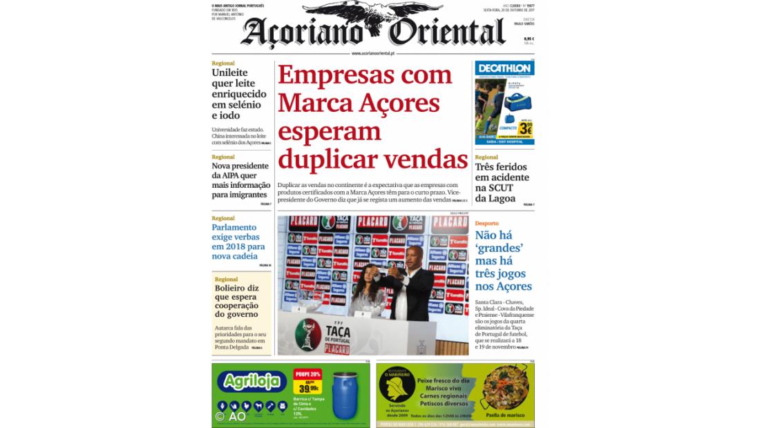"Três feridos em acidente na SCUT da Lagoa" e "Parlamento exige verbas em 2018 para nova cadeia" são outros títulos na primeira página desta sexta-feira, onde o Desporto destaca os três jogos da quarta eliminatória da Taça de Portugal de futebol que se realizam nos Açores a 18 e 19 de novembro.