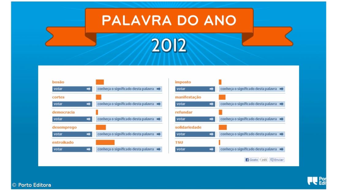 A votação para a "palavra do ano" decorre "on-line", desde 7 de dezembro, em www.portoeditora.pt/palavradoano, e a vencedora será divulgada no dia 04 de janeiro, numa cerimónia na Biblioteca José Saramago, em Loures.