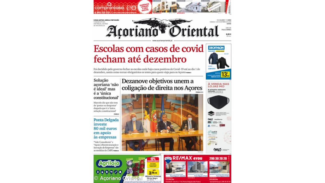 "Dezanove objetivos unem a coligação de direita nos Açores" é o título da manchete fotográfica. "Solução açoriana 'não é ideal' mas é a 'única constitucional'" e "Ponta Delgada investe 80 mil euros em apoio às empresas" são os outros títulos de capa do Açoriano Oriental.