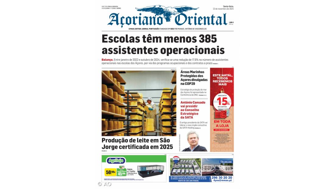 A redução do número de assistentes operacionais nas escolas dos Açores entre 2022 e 2024 está em destaque no Açoriano Oriental de sexta-feira, 22 de novembro de 2024.