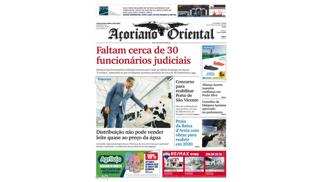 Na primeira página, é destacada ainda a entrevista de João Ponte, secretário regional da Agricultura e Florestas, onde este afirma que a distribuição não pode pôr o leite à venda quase ao preço da água.
