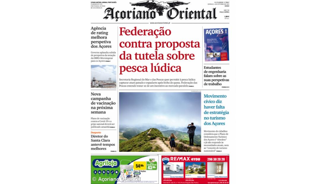 "Movimento cívico diz haver falta de estratégia no turismo dos Açores" é a manchete fotográfica. "Agência de rating melhora perspetiva dos Açores", "Nova campanha de vacinação na próxima semana", "Estudantes de engenharia falam sobre as suas perspetivas de trabalho" e "Diretor do Santa Clara antevê tempos melhores" são os restantes títulos de capa do Açoriano Oriental.