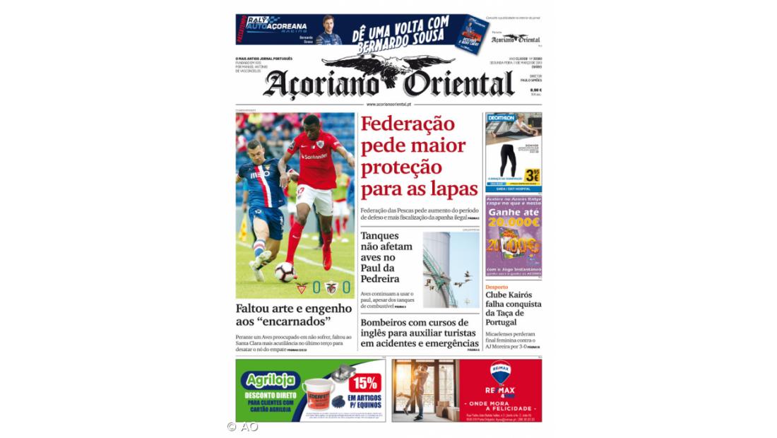 O destaque fotográfico do jornal vai para o empate sem golos entre o Santa Clara e o Desportivo das Aves, que mesmo assim mantém os encarnados de Ponta Delgada numa posição tranquila na I Liga.