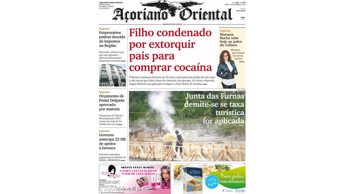 A manchete do Açoriano Oriental destaca que o tribunal condenou um homem a uma pena de prisão de três anos e oito meses por crimes de extorsão aos pais para satisfazer a dependência da cocaína.