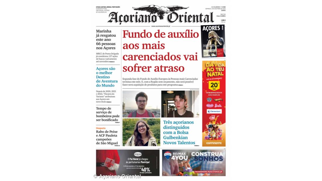 "Três açorianos distinguidos com a Bolsa Gulbenkian Novos Talentos" é a manchete fotográfica. "Marinha já resgatou este ano 66 pessoas nos Açores", "Açores são o melhor Destino de Aventura do Mundo", "Tempo de serviço de bombeiros pode ser bonificado" e "Rabo de Peixe e ACF Pauleta campeões de São Miguel" são os restantes títulos de capa do Açoriano Oriental.