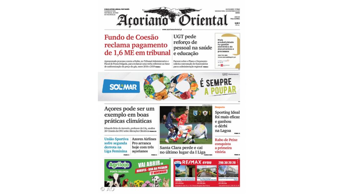 "Santa Clara perde e cai no último lugar da I Liga", é o título do destaque fotográfico da capa do Açoriano Oriental.