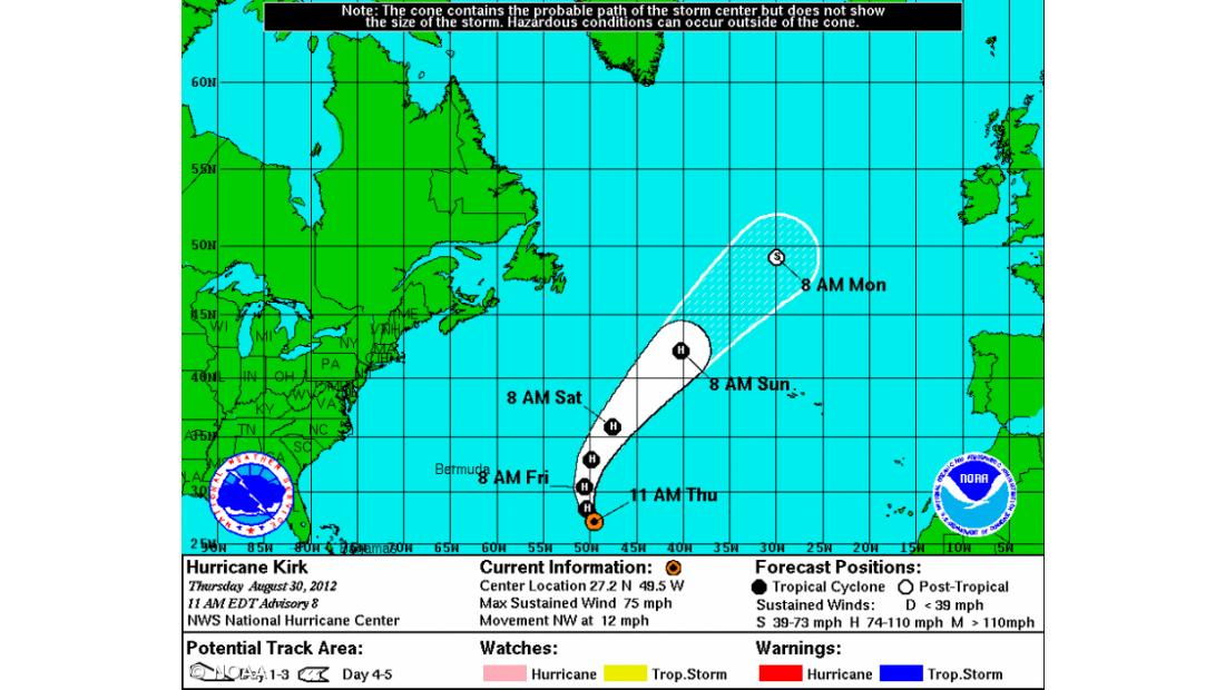 De acordo com Centro de Vigilância de Furacões, o "Kirk" deverá intensificar-se nas próximas 48 horas.