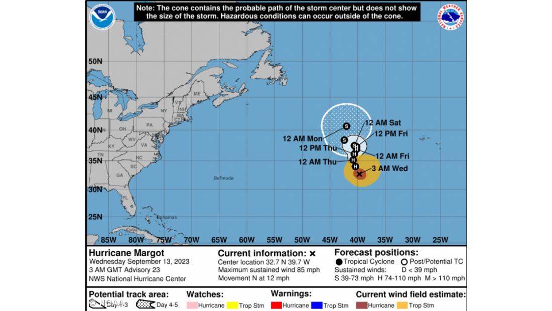 Segundo o IPMA, o furacão Margot (categoria 1 na escala de Saffir-Simpson), nomeado pelo National Hurricane Center (NHC), encontrava-se às 15:00 de terça-feira a cerca de 1.274 quilómetros a sudoeste da ilha das Flores.
