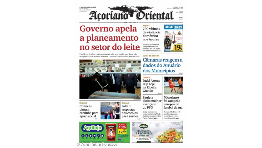 Crianças pintam carrinha para apoio social; Faltam respostas nas escolas para surdos; 700 vítimas de violência doméstica nos Açores; Câmaras reagem a dados do Anuário dos Municípios; Micaelense foi campeão europeu de futebol de rua; Pauleta eleito melhor avançado do PSG e Padel Azores Cup hoje na Ribeira Grande, são outros de capa do matutino.