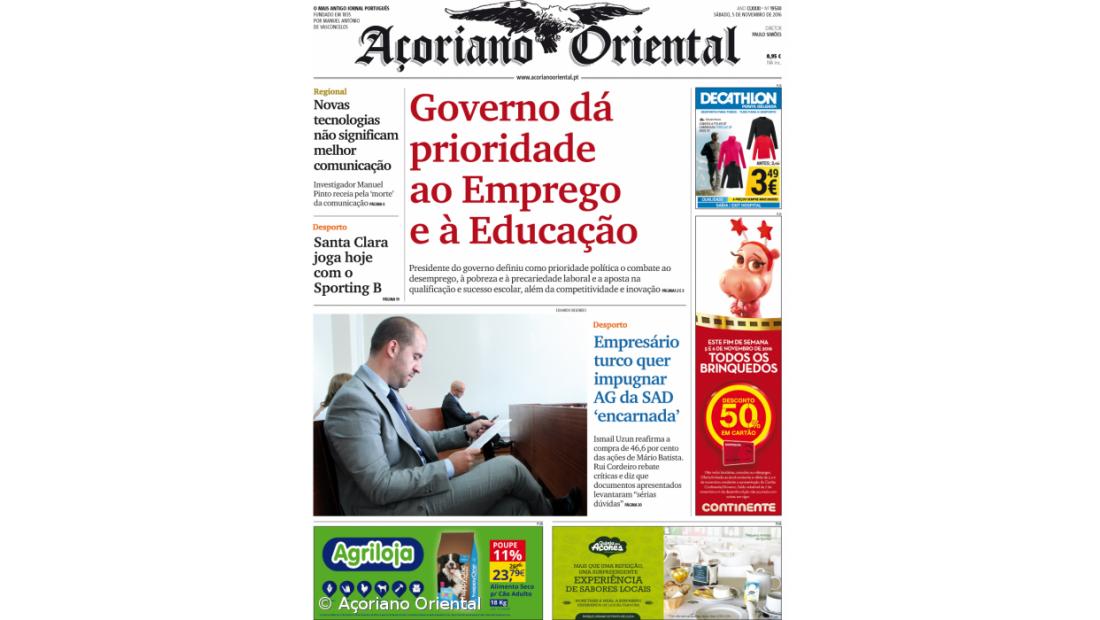 "Governo dá prioridade ao Emprego e à Educação" é a manchete do Açoriano Oriental