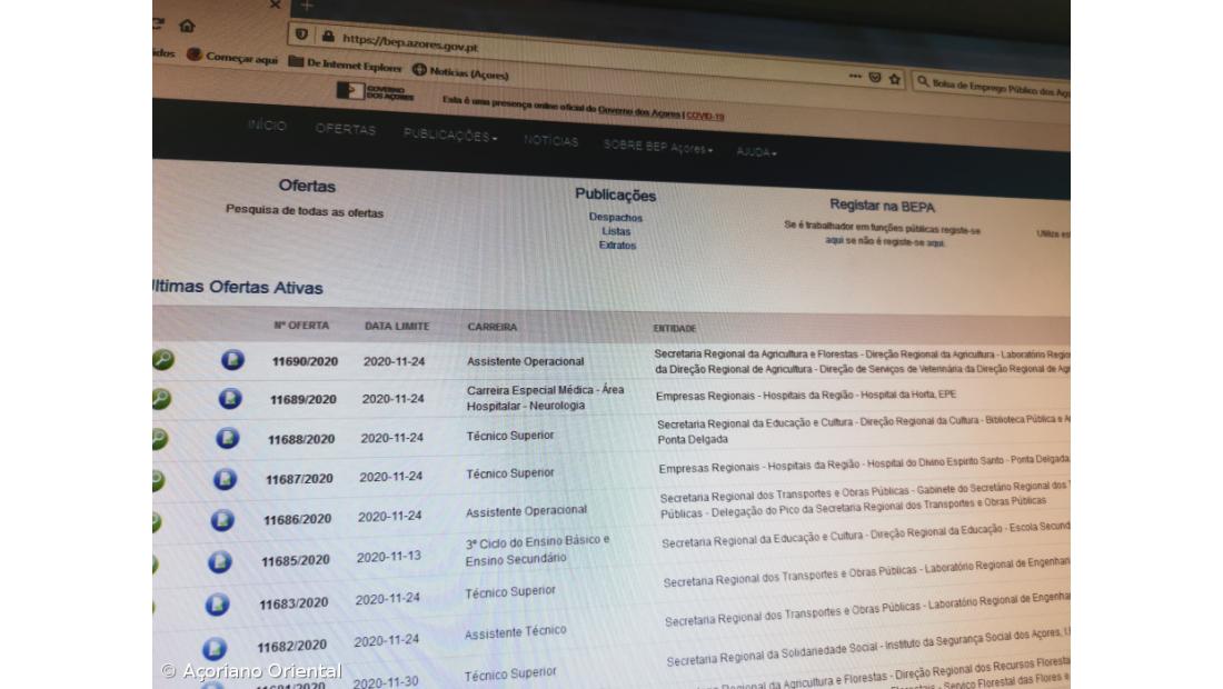 De acordo com a listagem de ofertas de emprego disponível na página da BEPA - Bolsa de Emprego Público dos Açores, consultada pela agência Lusa, só nas duas últimas semanas, foram publicados mais de 100 concursos, a maioria deles por tempo indeterminado, para a contratação de assistentes técnicos e operacionais, professores, técnicos superiores, técnicos de informática, inspetores, enfermeiros e terapeutas da fala, em toda a região.
