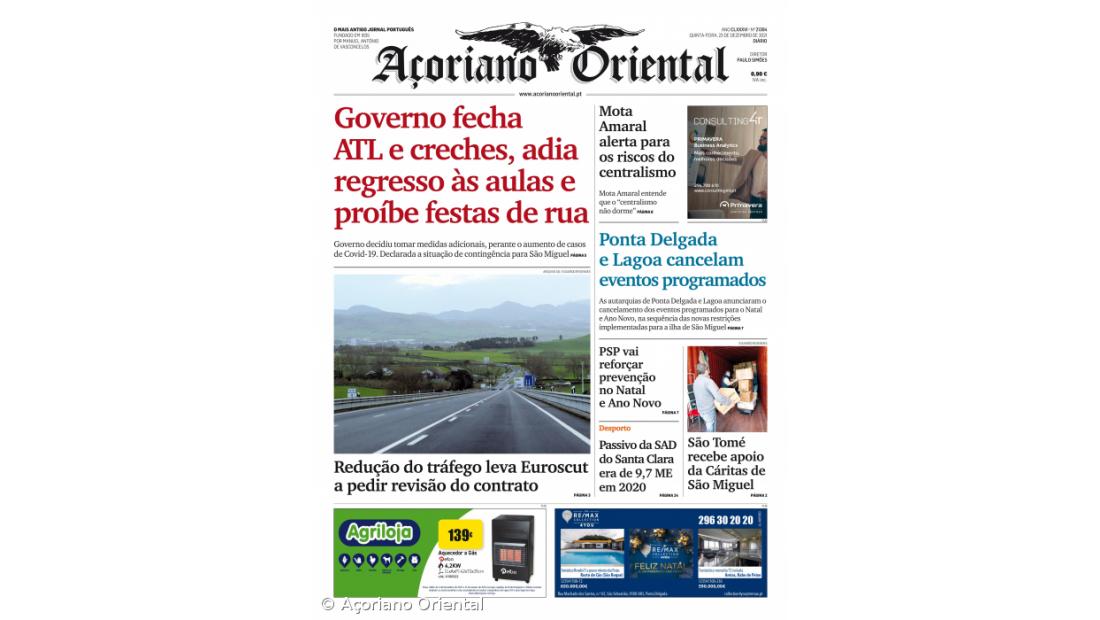 "Redução do tráfego leva Euroscut a pedir revisão do contrato" é a manchete fotográfica. "Mota Amaral alerta para os riscos do centralismo", "Ponta Delgada e Lagoa cancelam eventos programados", "PSP vai reforçar prevenção no Natal e Ano Novo", "São Tomé recebe apoio da Cáritas de São Miguel" e "Passivo da SAD do Santa Clara era de 9,7 ME em 2020" são os restantes títulos de capa do Açoriano Oriental.
