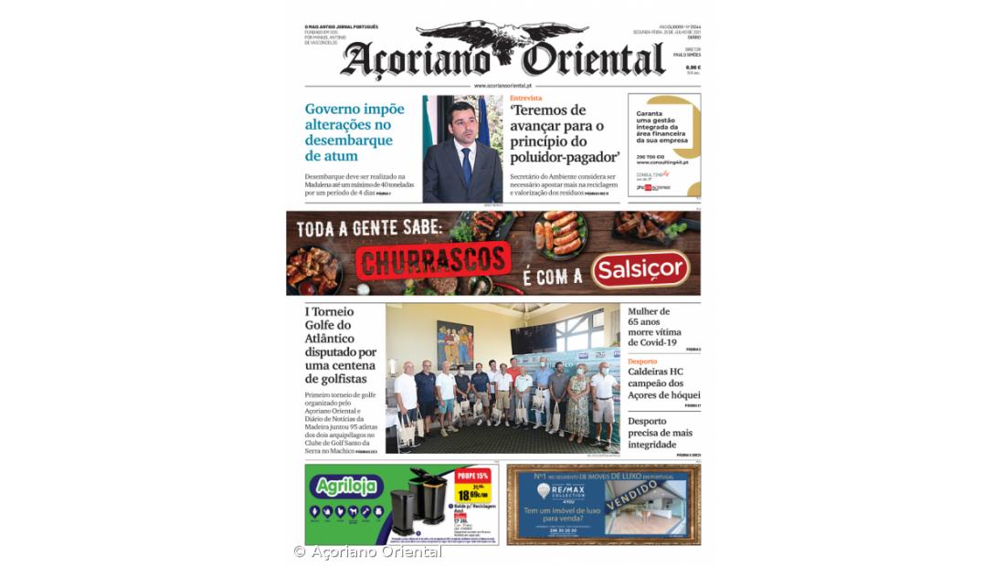 "I Torneio Golfe do Atlântico disputado por uma centena de golfistas" é a manchete fotográfica. "Teremos de avançar para o principio do poluidor-pagador", que remete para a entrevista concedida pelo Secretário Regional do Ambiente e Alterações Climáticas, "Mulher de 65 anos morre vítima de Covid-19", "Caldeiras HC campeão dos Açores de hóquei" e "Desporto precisa de mais integridade" são os restantes títulos de capa do Açoriano Oriental.