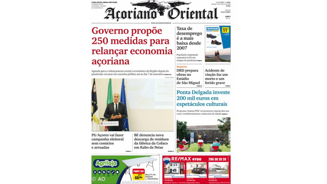 A apresentação da agenda para o relançamento social e económico da Região no pós-pandemia está em destaque no Açoriano Oriental de sábado, 8 de agosto de 2020.