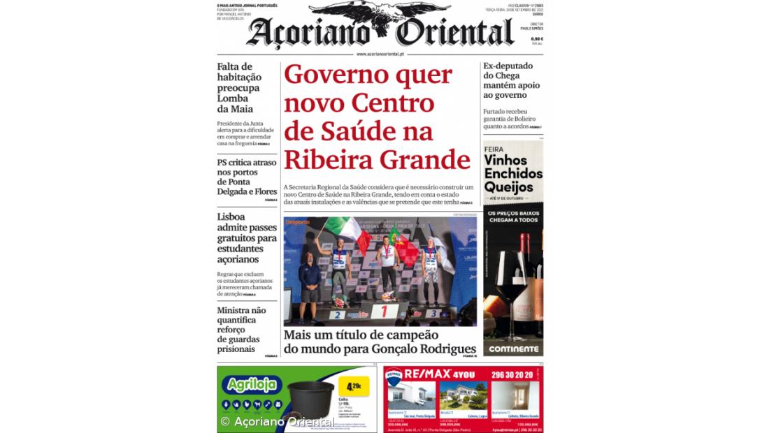 "Mais um título de campeão do mundo para Gonçalo Rodrigues" é a manchete fotográfica. "Falta de habitação preocupa Lomba da Maia", "PS critica atraso nos portos de Ponta Delgada e Flores", "Lisboa admite passes gratuitos para estudantes açorianos", "Ministra não quantifica reforço de guardas prisionais" e "Ex-deputado do Chega mantém apoio ao governo" são os restantes títulos de capa do Açoriano Oriental.