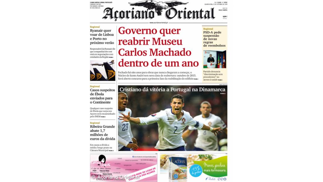 Com grande destaque fotográfico surge a vitória de Portugal diante da Dinamarca por uma bola a zero. "PSD-A pede suspensão de novas regras de reembolsos", "Ryanair quer voar de Lisboa e Porto no próximo verão", "Casos suspeitos de Ébola enviados para o Continente" e "Ribeira Grande abate 1,7 milhões de euros da dívida" são os outros títulos de capa.