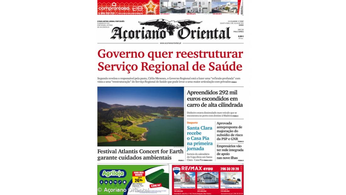 "Festival Atlantis Concert for Earth garante cuidados ambientais" é a manchete fotográfica. "Apreendidos 292 mil euros escondidos em carro de alta cilindrada", "Aprovada anteproposta de majoração do subsídio de risco da PSP e GNR", "Empresários vão ter rede integrada de apoio nas nove ilhas" e "Santa Clara recebe o Casa Pia na primeira jornada" são os restantes títulos de capa do Açoriano Oriental.