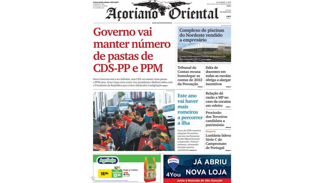 "Governo vai manter número de pastas de CDS-PP e PPM" é a manchete da edição desta sexta-feira do Açoriano Oriental.