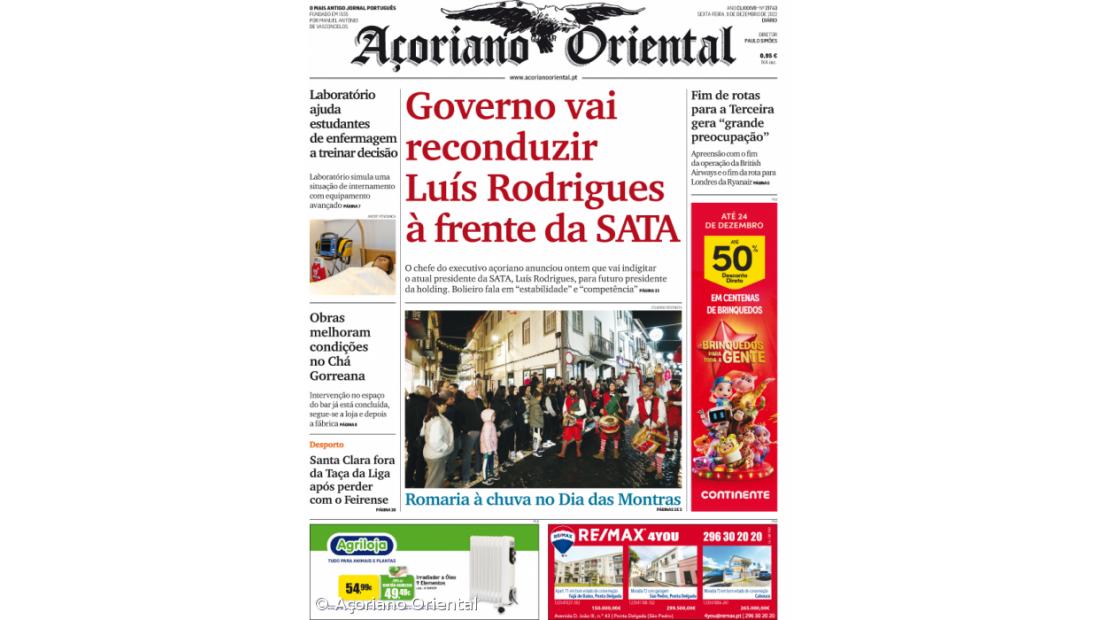 "Governo vai reconduzir Luís Rodrigues à frente da SATA" é a manchete do Açoriano Oriental