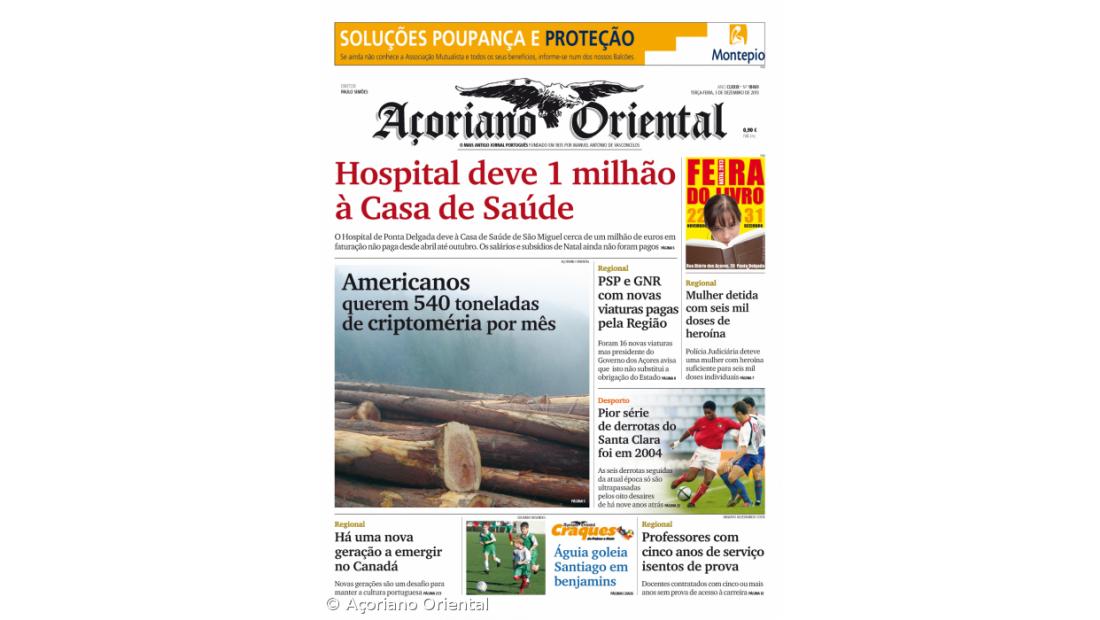 Americanos querem 540 toneladas de criptoméria por mês é outro grande destaque com foto na primeira página. Na capa o matutino chama ainda outros títulos, como a PSP e GNR com novas viaturas pagas pela Região, mas presidente do Governo dos Açores avisa que isto não substitui a obrigação do Estado; Mulher detida com seis mil doses de heroína e Há uma nova geração a emergir no Canadá para manter a cultura portuguesa e Professores com cinco anos ou mais anos de serviço isentos de prova de acesso à carreira.