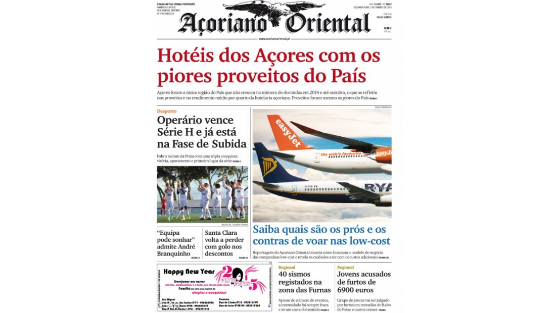 Os baixos proveitos registados pela holetaria em 2014 e até outubro, em resultado dos Açores terem sido a única região nacional que não cresceu em dormidas no ano passado estão em destaque no Açoriano Oriental de segunda-feira, 5 de janeiro de 2015.