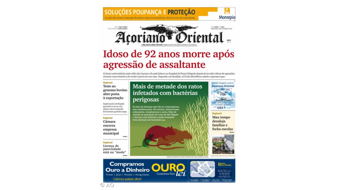 "Mais de metade dos ratos infetados com bactérias perigosas" é outro título de grande destaque da primeira página da edição de hoje, onde é notícia também "Mau tempo desaloja famílias e fecha escolas", "Teste genoma bovino abre porta à exportação", "Câmara encerra empresa municipal" e "licança de paternidade está na moda".