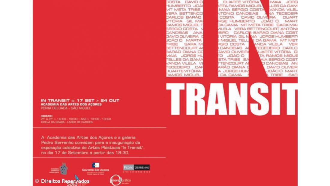In Transit, exposição organizada pela Galeria Pedro Serrenho – Lisboa, para a Academia das Artes dos Açores – Ponta Delgada, propõe uma mostra de artistas que trabalham assiduamente com a galeria. A saber: António Candeias, Ana Tecedeiro, Carlos Barão, Diana Costa, David Oliveira, Duarte Vitória, Gil Maia, Jorge Humberto – JOH, João Ó, Marta Ramos, Miguel Telles da Gama, MT – Meta Tribe, Sara Maia, Sérgio Costa, Vanda Vilela e Vera Bettencourt.