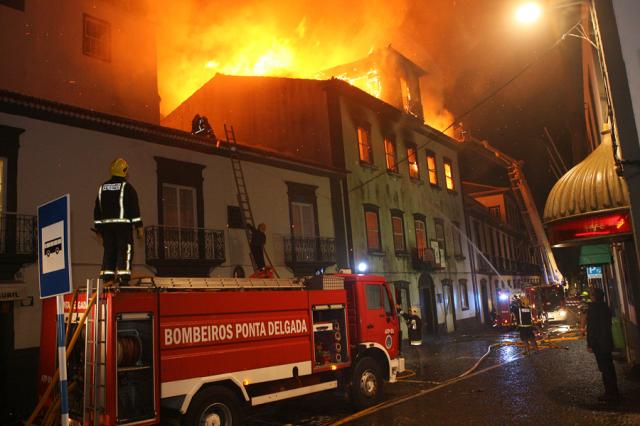 O fogo no edifício foi combatido por 65 bombeiros e 15 viaturas de três corpos de bombeiros de Ponta Delgada e de Vila Franca do Campo.