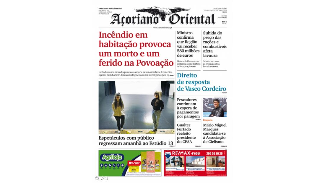 "Espetáculos com público regressam amanhã ao Estúdio 13", é o título do destaque fotográfico da capa do Açoriano Oriental.
