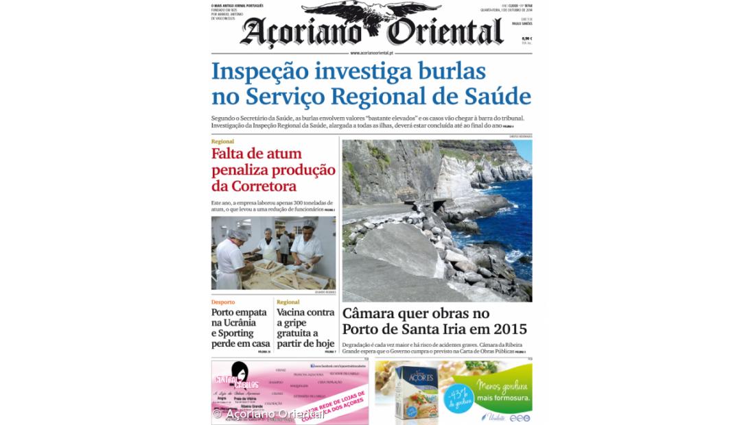 A capa do Açoriano Oriental noticia ainda, com destaque fotográfico, que a Câmara da Ribeira Grande quer obras no Porto de Santa Iria em 2015 e que a falta de atum penalizou a produção da empresa Corretora. "Vacina contra a gripe gratuita a partir de hoje" e "Porto empata na Ucrânia e Sporting perde em casa" são os outros títulos de capa.