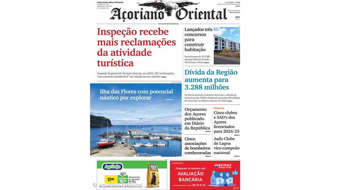 A manchete do Açoriano Oriental noticia que a Inspeção Regional do Turismo instruiu, em 2023, 267 reclamações da atividade turística, "um aumento considerável" em relação ao ano anterior.