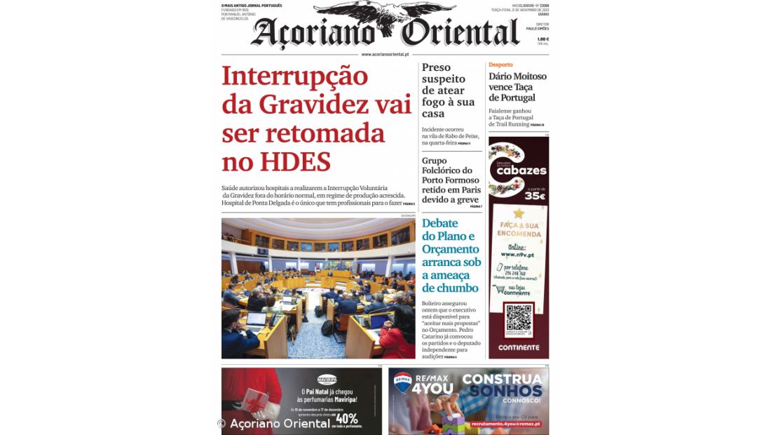 "Interrupção da Gravidez vai ser retomada no HDES" é a manchete do Açoriano Oriental