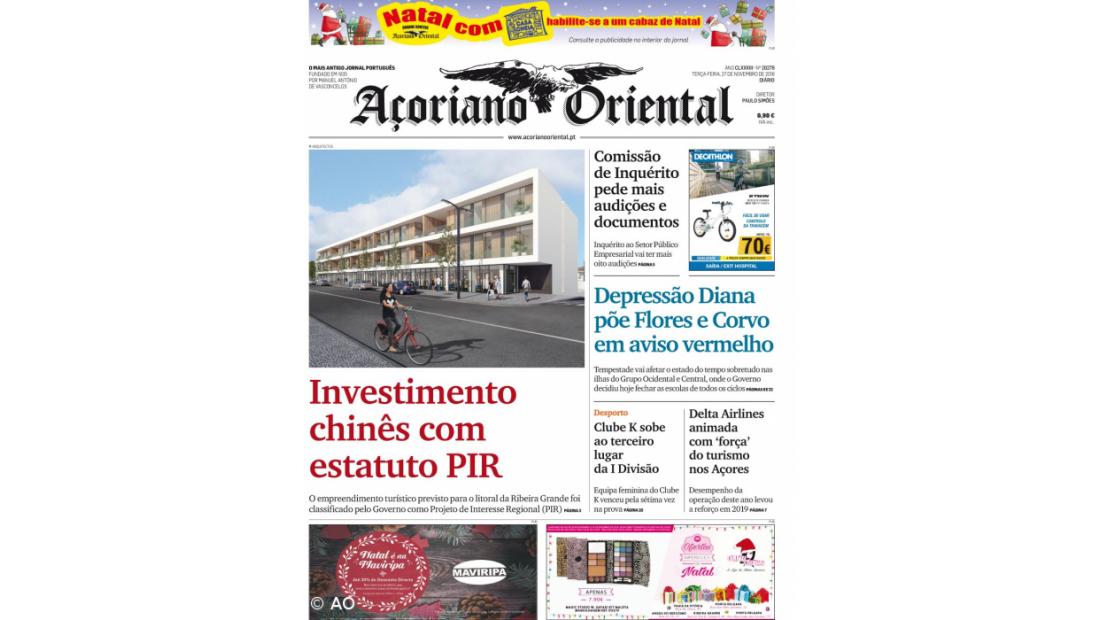 "Investimento chinês com estatuto PIR" é a manchete do Açoriano Oriental
