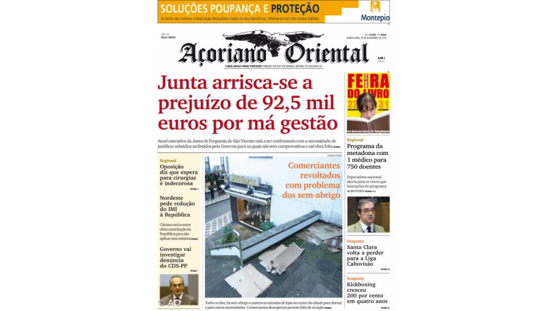 A primeira página da edição de hoje dá destaque à situação da Junta de Freguesia de São Vicente deixada pela anterior gestão