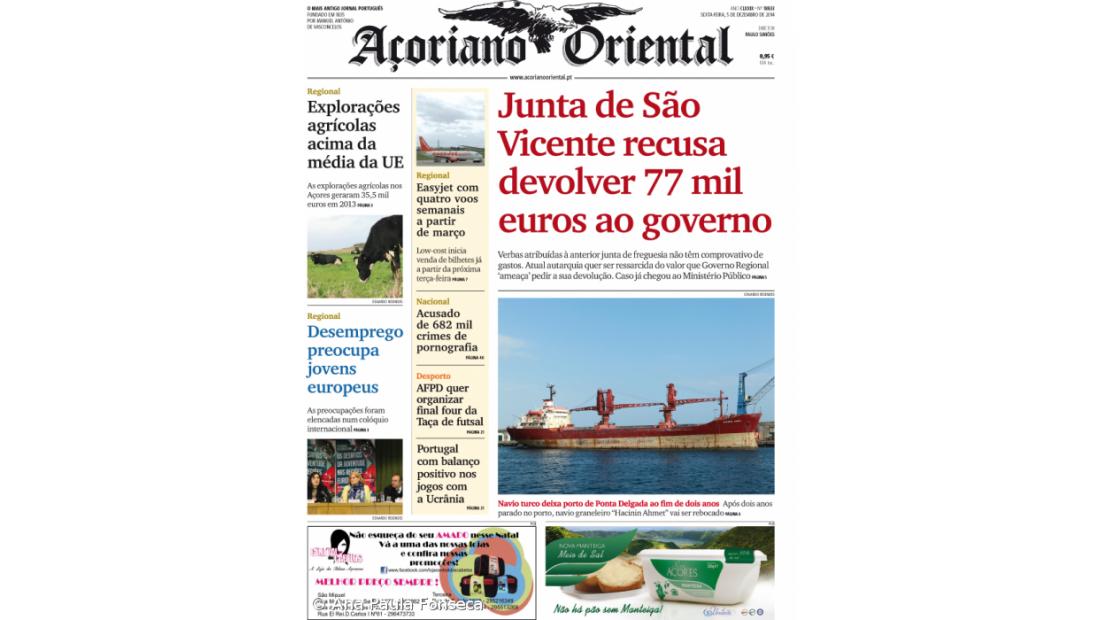As explorações agrícolas nos Açores geraram 35,5mil euros em 2013, estando acima da média da UE; Desemprego preocupa jovens europeus; Easyjet com quatro voos semanais a partir de março e navio turco deixa porto de Ponta Delgada ao fim de dois anos são outros títulos.