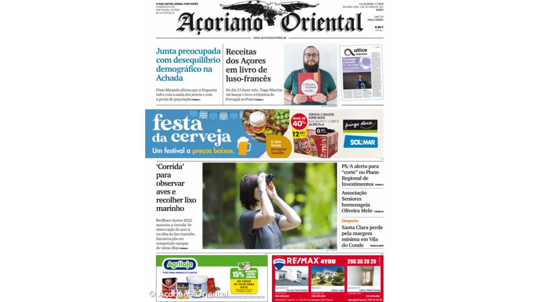 "'Corrida' para observar aves e recolher lixo marinho" é o título da manchete fotográfica. "Receitas dos Açores em livro de luso-francês", "PS/A alerta para 'corte' no Plano Regional de Investimentos", "Associação Seniores homenageia Oliveira Melo" e "Santa Clara perde pela margem mínima em Vila do Conde" são os restantes títulos de capa do Açoriano Oriental.