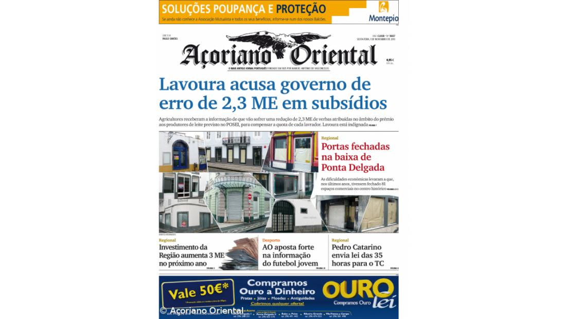 "Lavoura acusa governo de erro de 2,3 ME em subsídios" é a manchete do Açoriano Oriental