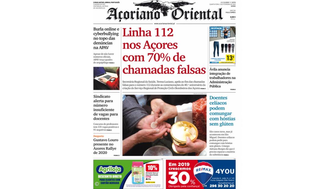 "Gustavo Louro presente no Azores Rallye de 2020", "Burla online e cyberbullying no topo das denúncias na APAV", "Sindicato alerta para número insuficiente de vagas para docentes" e "Ávila anuncia integração de trabalhadores na Administração Pública" são outros destaques do jornal.