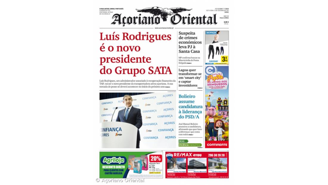 "Luís Rodrigues é o novo presidente do Grupo SATA" é a manchete do Açoriano Oriental