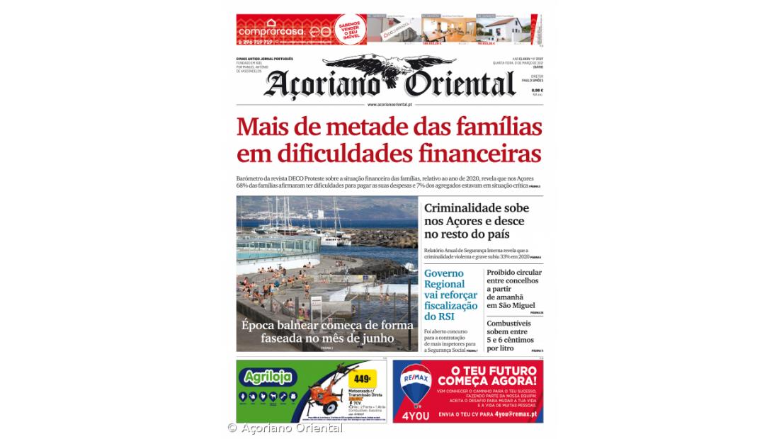 A manchete do Açoriano Oriental noticia - com base no barómetro da revista DECO Proteste relativo a 2020 - que nos Açores 68% das famílias afirmaram ter dificuldades para pagar as suas despesas e 7% estavam em situação crítica.