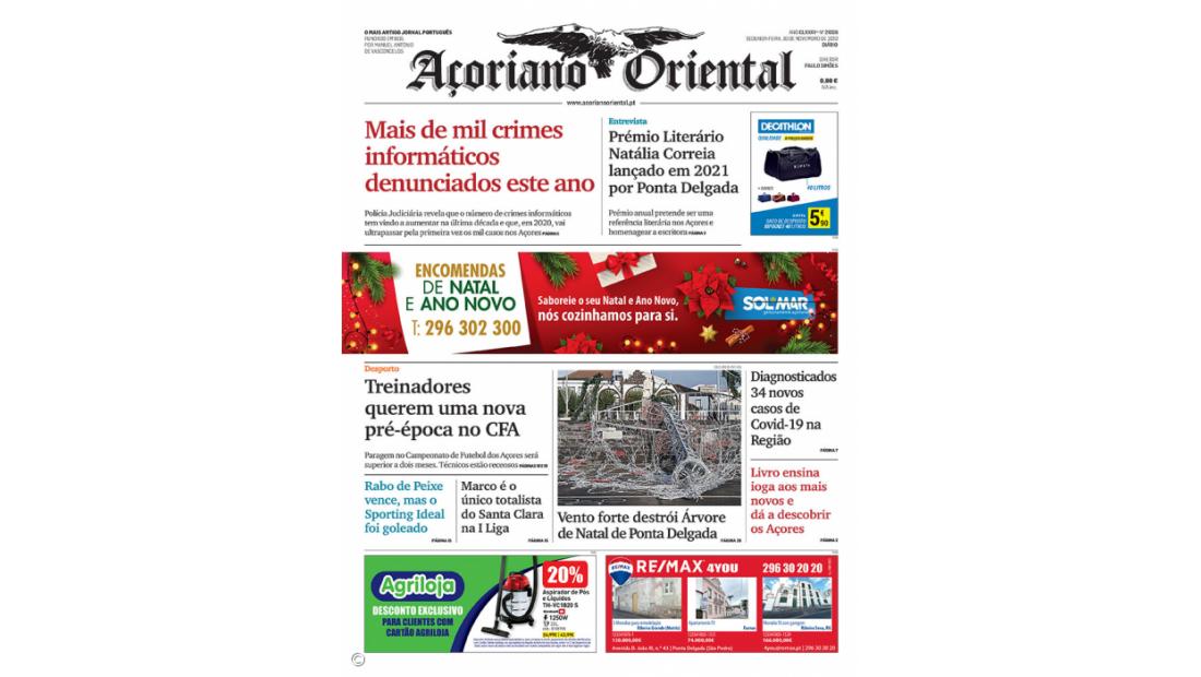 Ainda nesta edição: "Prémio Literário Natália Correia lançado em 2021 por Ponta Delgada", "Vento forte destrói Árvore de Natal de Ponta Delgada", "Diagnosticados 34 novos casos de Covid-19 na Região" e "Livro ensina ioga aos mais novos e dá a descobrir os Açores".