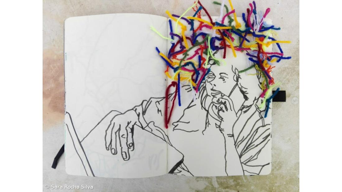 Um registo do teletrabalho de quem está no exterior observando. Coloquei uma foto do após e outra posterior, porque achei curioso as linhas de lã ganharem um aspeto tosco, espalmadas, com o virar das páginas (onde se seguiram e seguem novos registos) e fechamento do caderno.